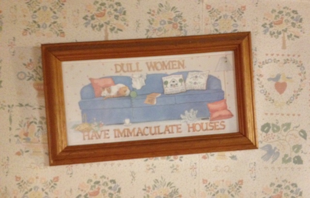 This sign hangs above my kitchen door. And no, I did not tilt it for effect. The cobwebs are real, too. For 25 years, this sign has made me feel less guilty about not cleaning my house as often as I should.