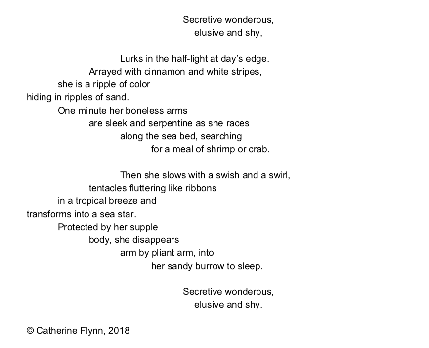 Wonderpus! The name by itself incites the imagination. I love the structure of your poem, Catherine, and your careful choice of words to describe this beautiful creature—a ripple of color, tentacles fluttering like ribbons. So evocative!