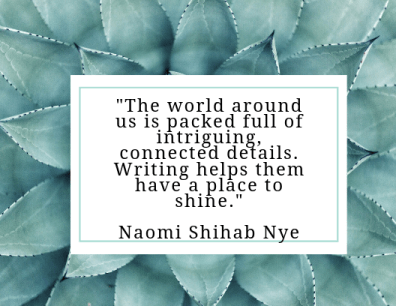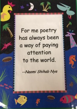 Naomi Shihab Nye’s poetry has informed my teaching and writing for many years. I am thrilled about her recent selection as our Young People’s Poet Laureate. Her poetry inspires, and she generously shares her wisdom in interviews, presentations, and volumes such as Seeing the Blue Between: Advice and Inspiration for Young Poets, Rip the Page! Adventures in Creative Writing, and more. I created this sign early in my career and it still hangs in my classroom:
