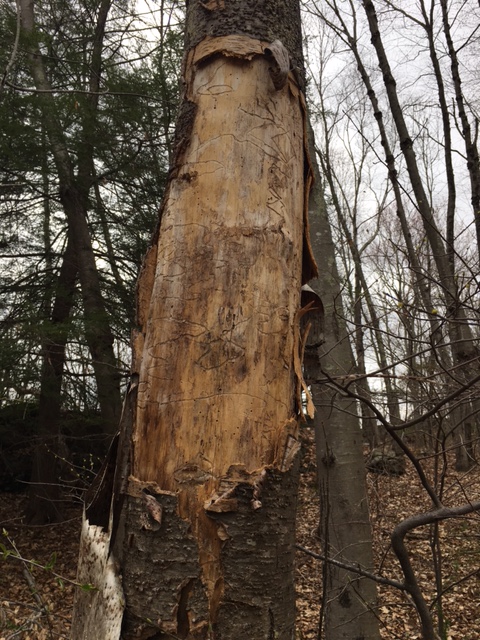 Pass a tree stripped of its bark.
