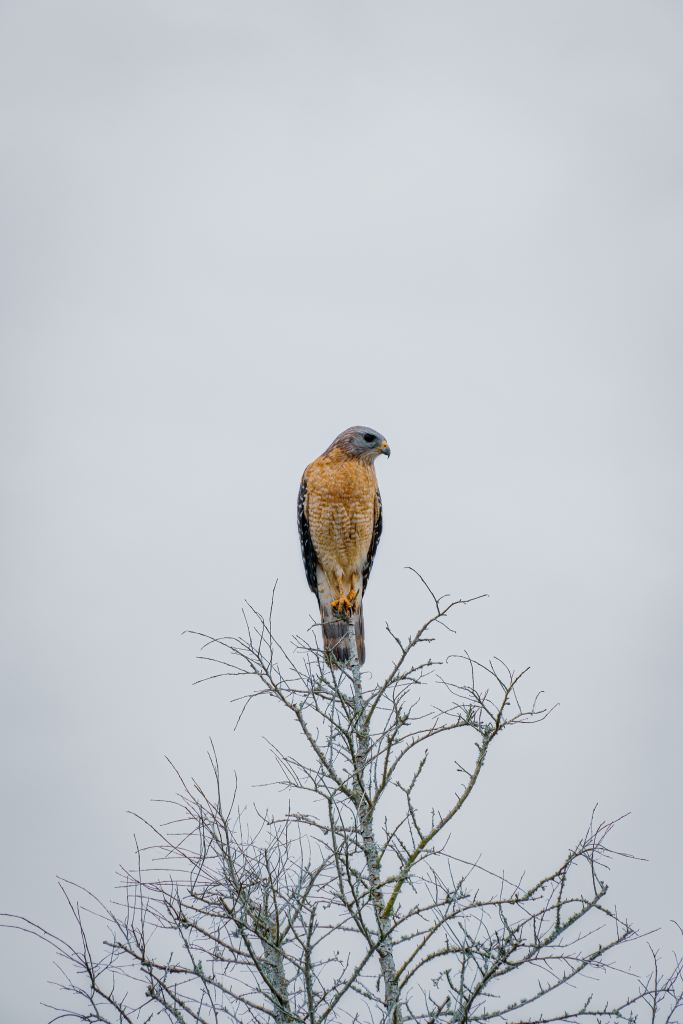 Hawk, sitting still as a statue Atop an old snag Waiting, watching, her Keen eyes peeled for her next meal.