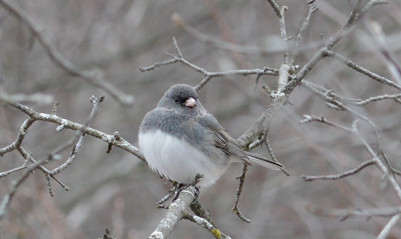 All winter long a chittering of juncos forage for seeds under a maple tree, hopping on short, slender legs, their pink beaks pecking in snow or leaf litter. Tilting heads from side to side, bright black eyes always alert for hawk’s shadow, ready to flutter for cover in an instant melting into a gray and white world.