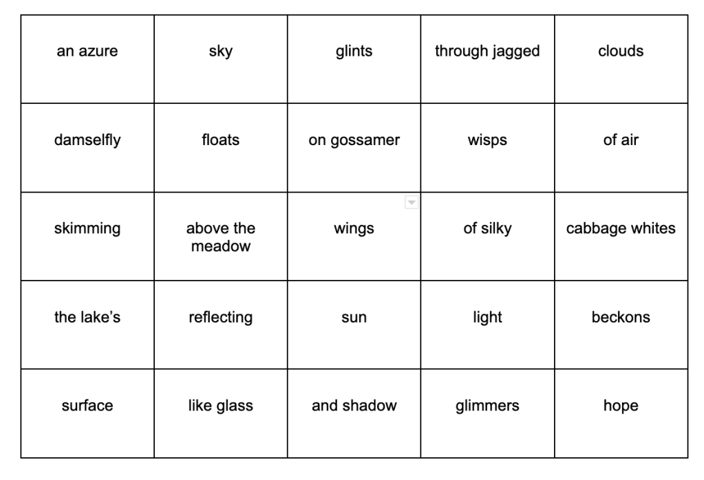 2. I’m so sorry about your stepfather, Catherine. Even though a loss is anticipated, it can still feel somehow surprising, with unexpected layers. Your Sudoku poem is just lovely. I especially like your starting with “an azure” and then going in two different, yet related, directions. I love the appreciation of nature and the peaceful mood that runs through this poem. Thinking of you!