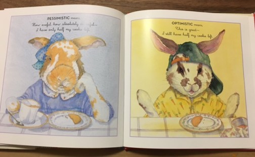 And so it was that this book was sitting on my desk this morning when a first grade student arrived in my room with a very long face. He has struggled and made slow progress since the beginning of the year. “What’s wrong?” I asked. He explained that he’d had a run in with another student during P.E, and had gotten in trouble. I knew my lesson would be wasted if I just went ahead. So I pulled out Cookies and began reading. By the time we got to this page, he was smiling and agreed it would be better to be optimistic than pessimistic.