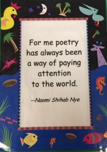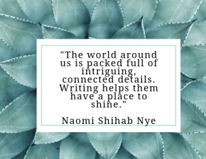 Kimmerer goes on to say that in order to “create sustainable humanity” we must rediscover our “gratitude and our capacity for reciprocity.” As I grapple with the sad facts of our current world, this encourages me. Kimmerer also sees “the very facts of the world [as] a poem.” Reading and writing poetry help me build my capacity for gratitude, for reciprocity. I am grateful to this community for the encouragement it provides. Here then, as an act of reciprocity, is a poem from Naomi Shihab Nye, one of our greatest teachers of gratitude and reciprocity.
